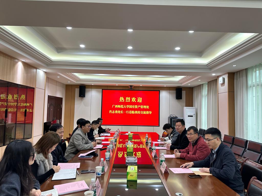 3月24日上午,广西师范大学国有资产管理处处长肖志勇一行4人来我校就国有资产管理工作进行调研。我校资产与实验室管理处、房产管理处相关业务负责同志参与了此次调研交流。